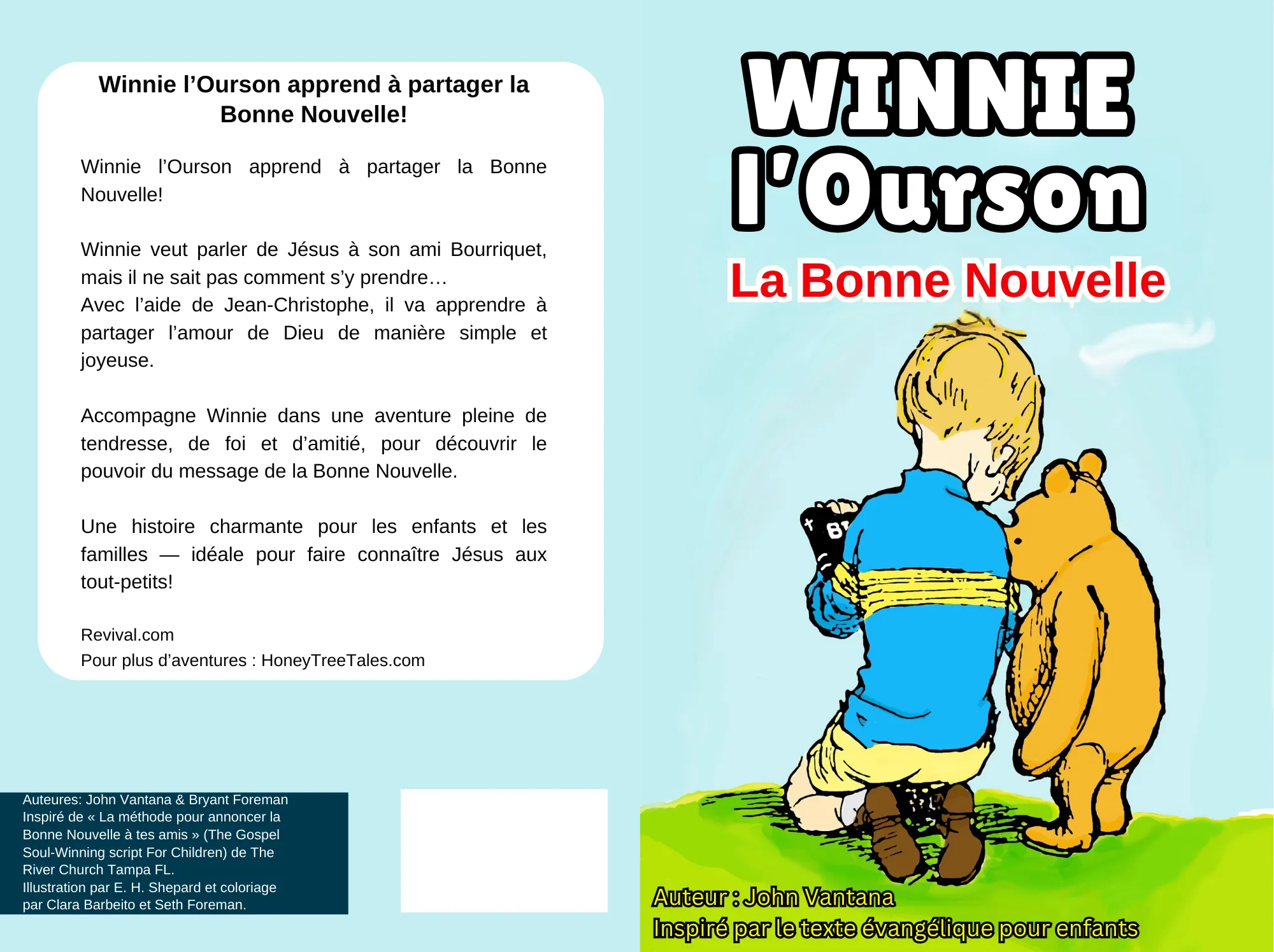 Winnie l’Ourson apprend à partager la Bonne Nouvelle !Winnie veut parler de Jésus à son ami Bourriquet, mais il ne sait pas comment s’y prendre…Avec l’aide de Jean-Christophe, il va apprendre à partager l’amour de Dieu de manière simple et joyeuse.Accompagne Winnie dans une aventure pleine de tendresse, de foi et d’amitié, pour découvrir le pouvoir du message de la Bonne Nouvelle.Une histoire charmante pour les enfants et les familles — idéale pour faire connaître Jésus aux tout-petits !
